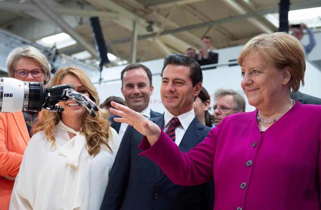 ▲德國(guó)總理默克爾(右)和墨西哥總統(tǒng)培尼亞(中)共同參觀了漢諾威工業(yè)博覽會(huì)
