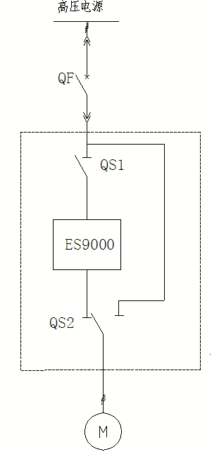 一拖一手動旁路柜包含兩個隔離刀閘QS1、QS2及相關(guān)保護(hù)電機(jī)設(shè)備。正常運(yùn)行時,變頻器拖動電機(jī)運(yùn)行,當(dāng)變頻出現(xiàn)故障時,可斷開電機(jī)變頻控制回路,合閘工頻回路,即可保持生產(chǎn)持續(xù)運(yùn)行;旁路柜中QS1、QS互鎖,當(dāng)QS1合閘時,QS2不能合閘至工頻側(cè),保證電路回路操作安全、可靠。