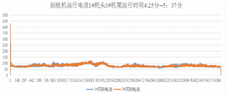 數(shù)據(jù)分析:此變頻器采用最新研發(fā)的轉(zhuǎn)矩板控制系統(tǒng),可以更好地平衡運行電流;刮板機 1-3#機頭機尾電機運行電流曲線基本重疊,最大啟動尖峰電流為429A,平均運行電流為78A, 設(shè)備運行平穩(wěn)滿足生產(chǎn)要求。
